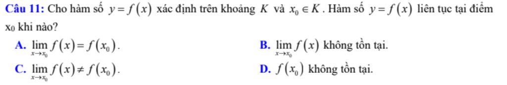 Câu 11: Cho hàm số y=f(x) xác định trên khoảng K và x0 ∈ K. Hàm số y = f(x) liên tục tại điểm x0 khi nào? A. $\lim\limits_{x \to x0}$ f(x)= f(x0). B. $\lim\limits_{x \to x0}$ không tồn tại. C. $\lim\limits_{x \to x0}$ f(x) $\neq$ f(x0). D. f(x0) không tồn tại.