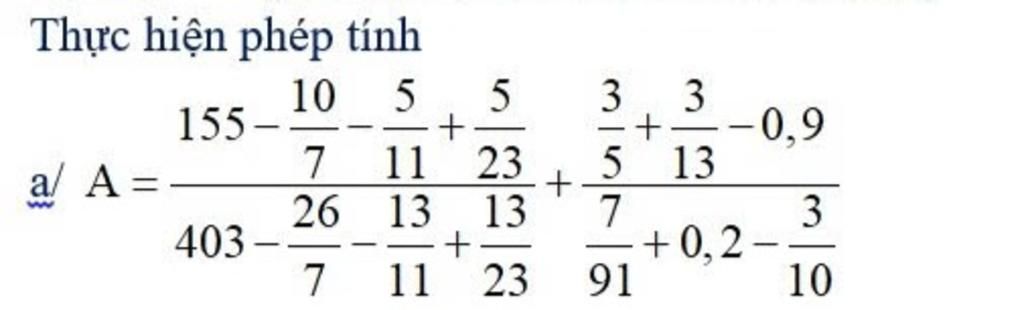 `a)``A=(155-10/7-5/11+5/23)/(403-26/7-13/11+13/23)+(3/5+3/13-0,9)/(7/91+0,2-3/10)`