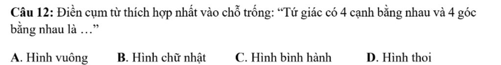 Tứ giác có `4` cạnh bằng nhau và `4` góc bằng nhau là hình vuông