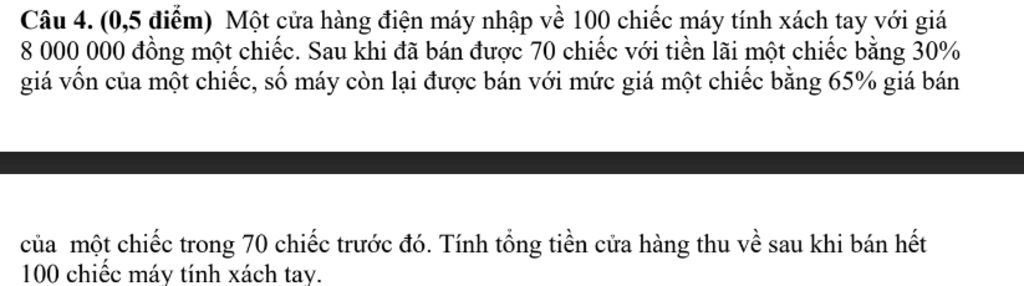 Câu 4. ( 0,5 điểm) Một cửa hàng điện máy nhập về 100 chiếc máy tính xách tay với giá 8000000 đồng một chiếc. Sau khi đã bán được 70 chiếc với tiền lãi một chiếc bằng $30 \%$ giá vốn của một chiếc, số máy còn lại được bán với mức giá một chiếc bằng $65 \%$ giá bán