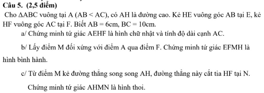 c / Từ điểm M kẻ đường thẳng song song AH , đường thẳng này cắt tia HF tại N . Chứng minh tứ giác AHMN là hình thoi.