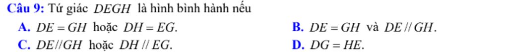 Tứ giác `DEGH` là HBH nếu `DE=GH` và `DE`//`GH`