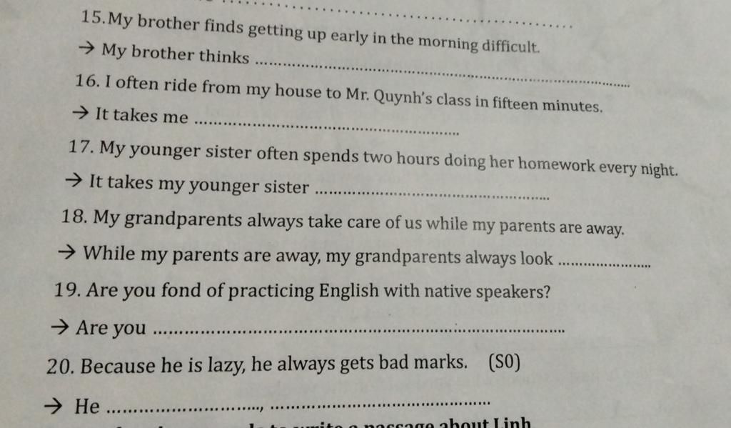 16. It takes me fifteen minutes to ride from my house to Mr. Quynh's class.
