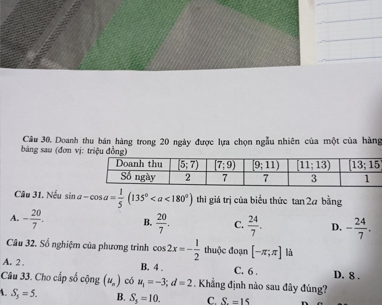 Nếu sin a -cos a = 1/5(135°<a<180°) thì giá trị của biểu thức tan2a bằng