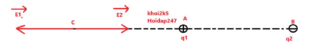 Do `q_1, q_2` trái dấu nên điểm `C` phải nằm ngoài đoạn `AB` và nằm trên đường thẳng `AB` để hai vecto cùng phương, cùng chiều.