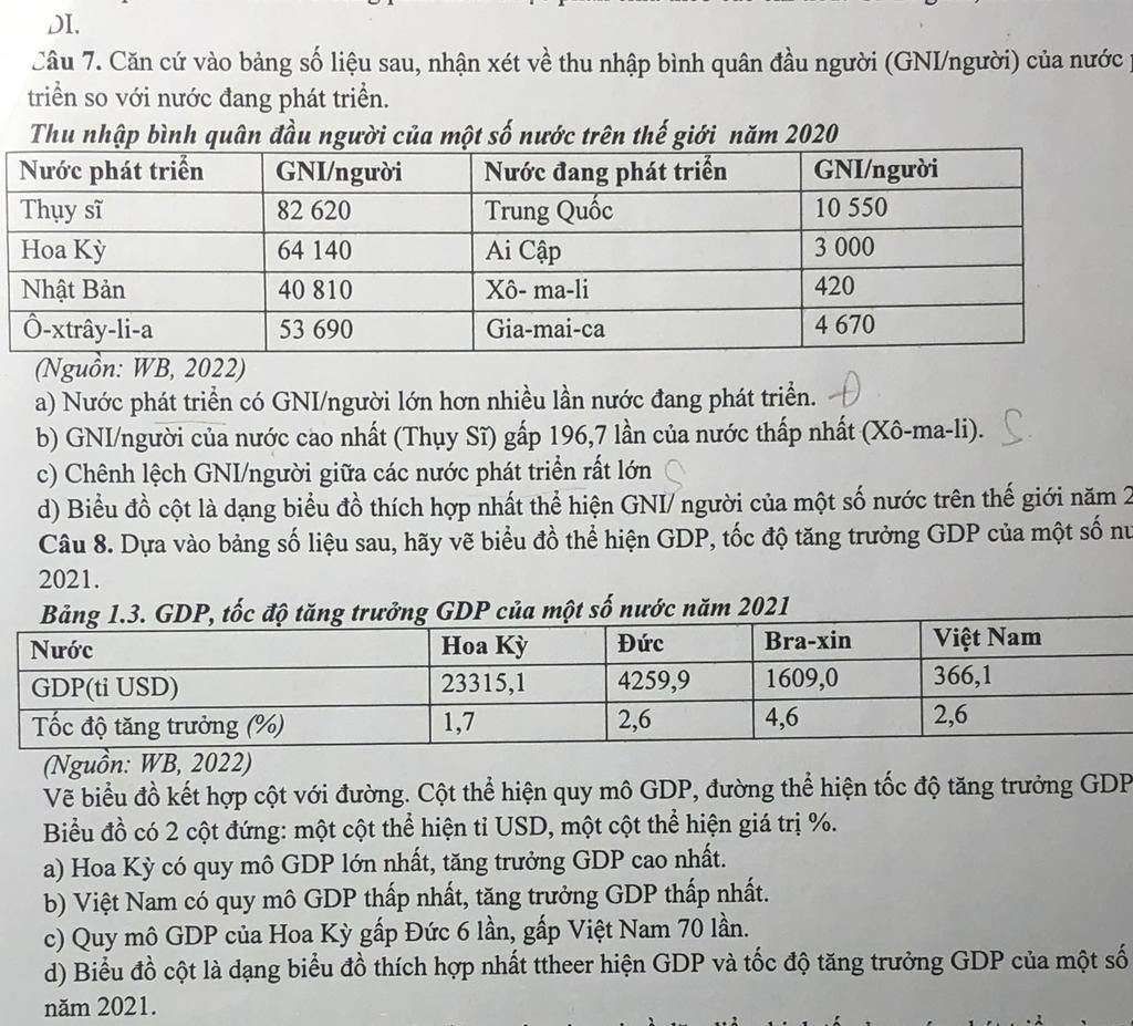 Câu 7. Căn cứ vào bảng số liệu sau, nhận xét về thu nhập bình quân đầu người (GNI/người) của nước