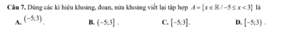 Tập `A` là 1 nửa khoảng từ `-5` đến 3, lấy điểm `-5`