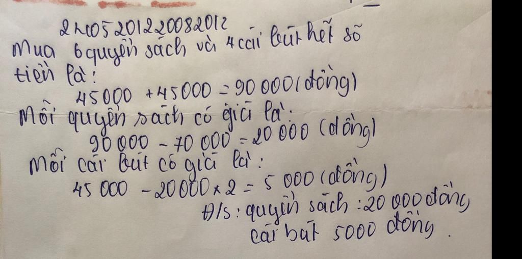 bài 2. Mua 3 quyển sách và 2 cái bút hết 45000 đồng. Mua 5 quyển sách và 4 cái bút cùng loại hết 70000 đồng. Tính giá tiền 1 cái bút, 1 quyển vở.