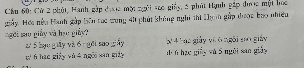 `6` con hạc giấy và `5` ngôi sao giấy mất số thời gian để gấp là `:`