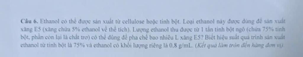 Câu 6. Ethanol có thể được sản xuất từ cellulose hoặc tỉnh bột. Loại ethanol này được dùng để sản xuất.