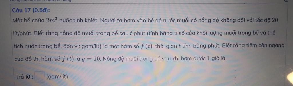 $\to f(t)=\dfrac{20\cdot 10t}{2000+20t}=\dfrac{10t}{t+100}$ (gam/lít)