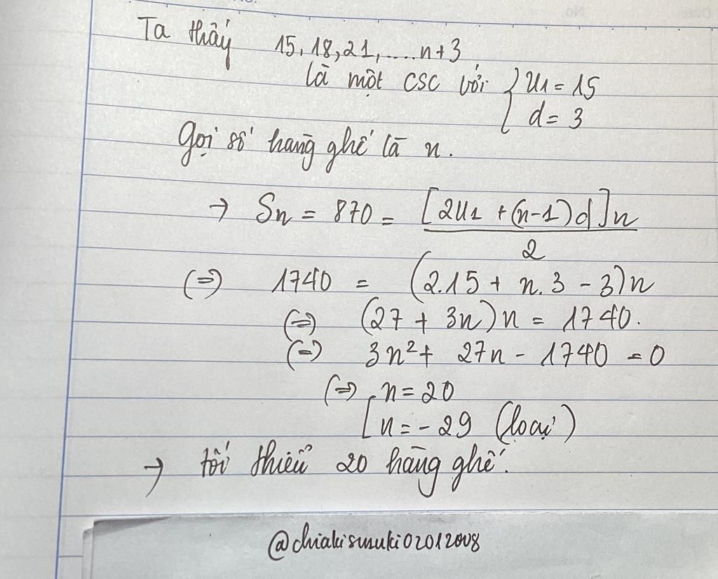 Một kiến trúc sư thiết kế một hội trường với 15 ghế ngồi ở hàng thứ nhất, 18 ghế ngồi ở hàng thứ hai,21 ghế ngồi ở hàng thứ ba và cứ như vậy (số ghế ở hàng sau nhiều hơn 3 ghế so với số ghế ở hàng liền trước nó).Nếu muốn hội trường đó có sức chứa ít nhất 870 ghế ngồi thì kiến trúc sư đó phải thiết kế tối thiểu bao nhiêu hàng ghế?