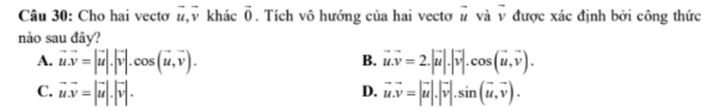 Câu 30: Cho hai vectơ $\vec{u}, \vec{v}$ khác $\overrightarrow{0}$. Tích vô hướng của hai vectơ $\vec{u}$ và $\vec{v}$ được xác định bởi công thức nào sau đây?