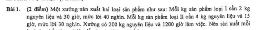 Bài 1. (2 điểm) Một xưởng sản xuất hai loại sản phẩm như sau: Mỗi kg sản phẩm loại 1 cần 2 kg nguyên liệu và 30 giờ, mức lời 40 nghìn. Mỗi kg sản phẩm loại II cằn 4 kg nguyên liệu và 15 giờ, mức lời 30 nghìn. Xường có 200 kg nguyên liệu và 1200 giờ làm việc. Nên sản xuất mỗi loại sản phẩm bao nhiêu để có mức lời cao nhất?