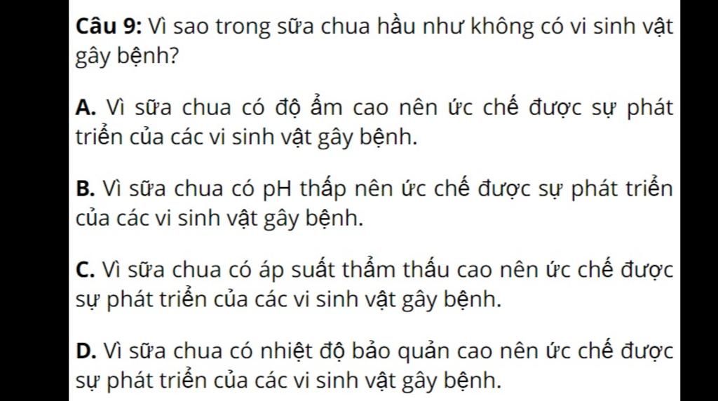 `->` Độ pH thấp của sữa chua đã ức chế được sự phát triển của các vi sinh vật gây bệnh