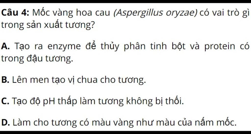 `@` Trong qua trình làm tương, mốc vàng hoa cau ( Aspergillus oryzae) tạo ra enzyme để thủy phân tinh bột và protein có trong đậu tương