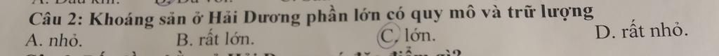 `->` Giải thích: Hải Dương có nguồn khoáng sản phong phú, đa dạng, đặc biệt là khoáng sản dùng để sản xuất vật liệu xây dựng với trữ lượng lớn và tập trung nhiều nhất ở huyện Kinh Môn và Chí Linh