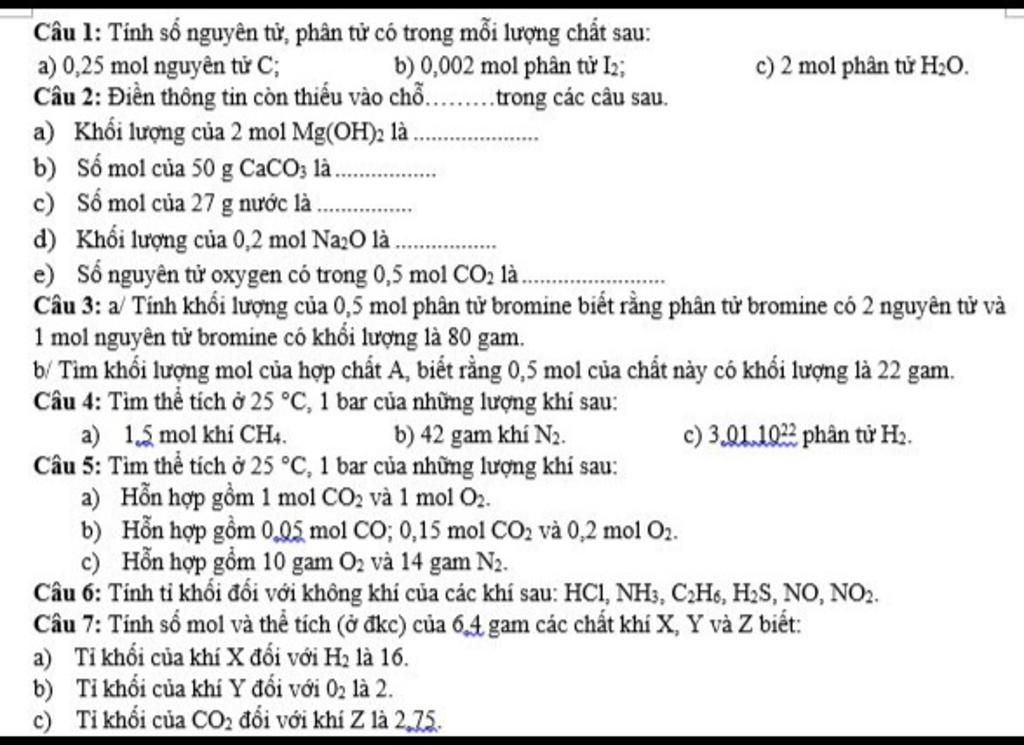 Câu 1: Tính số nguyên tử, phân tử có trong mỗi lượng chất sau: