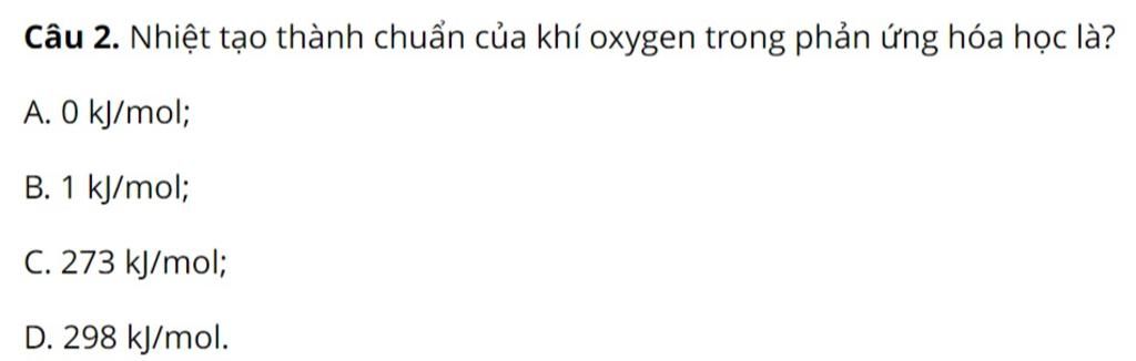 `->` Nhiệt tạo thành chuẩn của khí oxygen trong phản ứng hóa học là `0` `kj//mol`