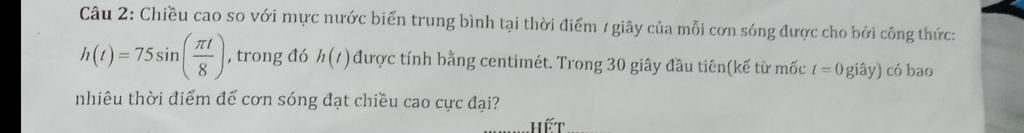 Câu 2: Chiều cao so với mực nước biển trung bình tại thời điểm t giây của mỗi cơn sóng được cho bởi công thức: