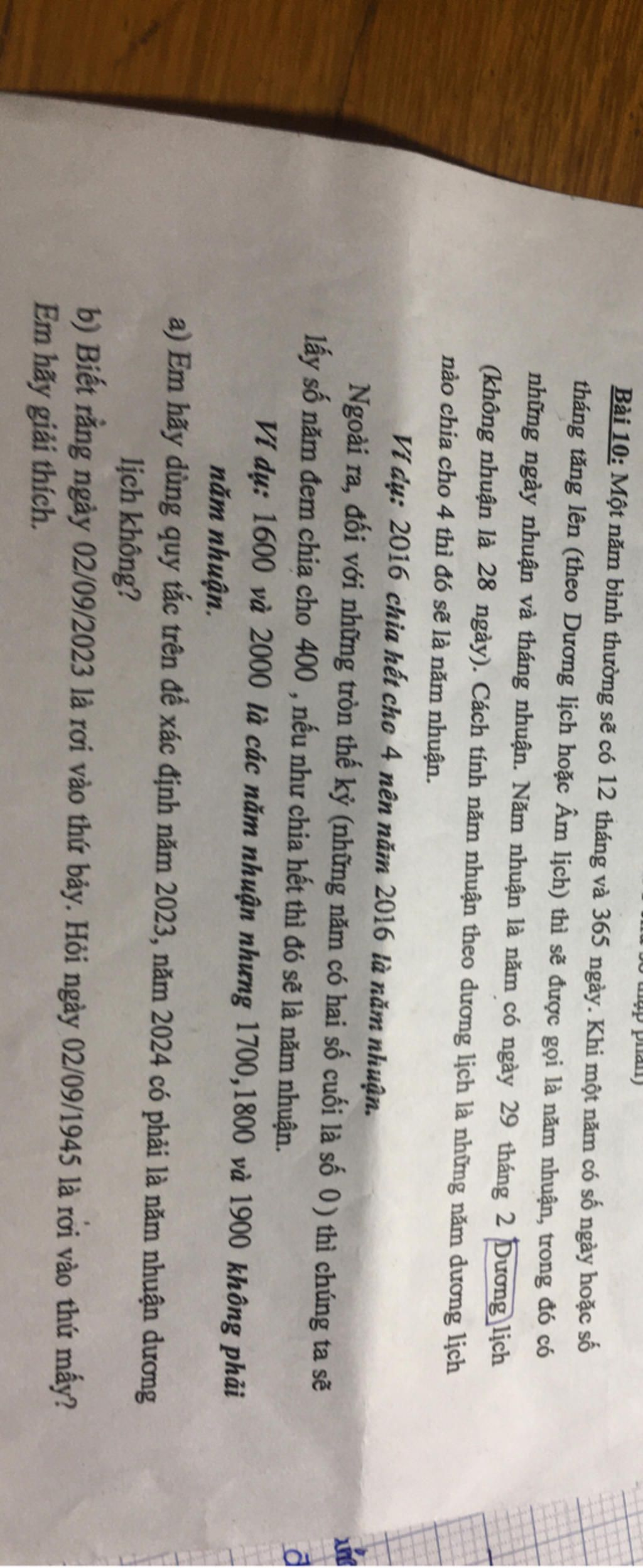 Bài 10: Một năm bình thường sẽ có 12 tháng và 365 ngày. Khi một năm có số ngày hoặc số