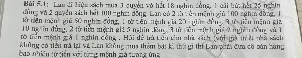 Vậy Lan phải trả số tờ tiền với mệnh giá tương ứng là :