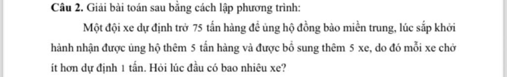 $\to$Ban đầu mỗi xe chở $\dfrac{75}x$ tấn hàng