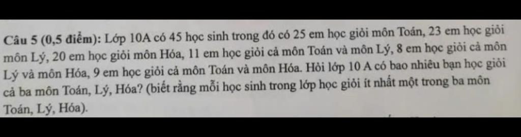 Câu 5 (0,5 điểm): Lớp 10A có 45 học sinh trong đó có 25 em học giỏi môn Toán, 23 em học giỏi