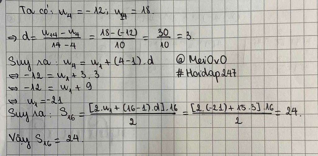 Cho cấp số cộng (Un) có u4=-12;u14=18. Tính tổng 16 số hạng đầu tiên của cấp số cộng này.