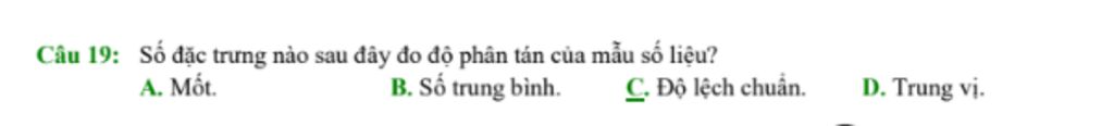 `@` Các số đặc trưng đo mức độ phân tán của mẫu số liệu là khoảng tứ phân vị, khoảng biến thiên, độ lệch chuẩn và phương sai.