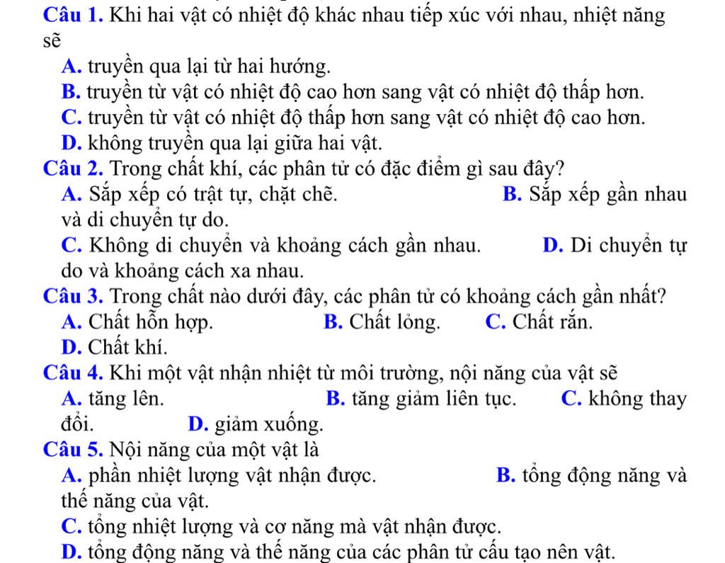 Nội năng là tổng năng lượng do chuyển động (động năng) và tương tác (thế năng) của các phân tử cấu thành vật.