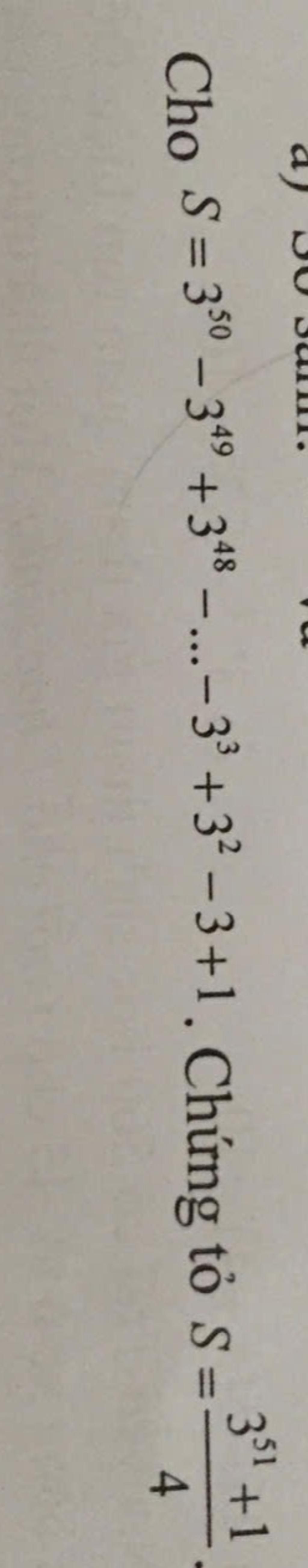 cho S=3^50 - 3^49 + 3^48 - ... - 3^3 + 3^2 - 3 + 1. Chứng tỏ S =3 mũ 51 phần 4