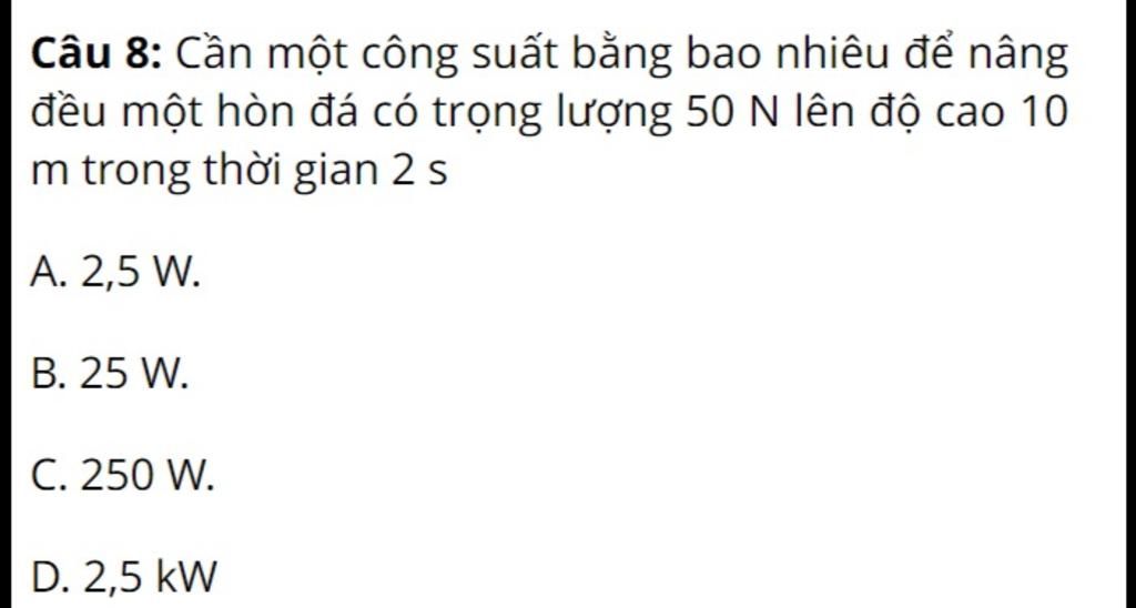 Công suất để nâng đều một hòn đá có trọng lượng 50 N lên độ cao 10 m trong thời gian 2 s là: