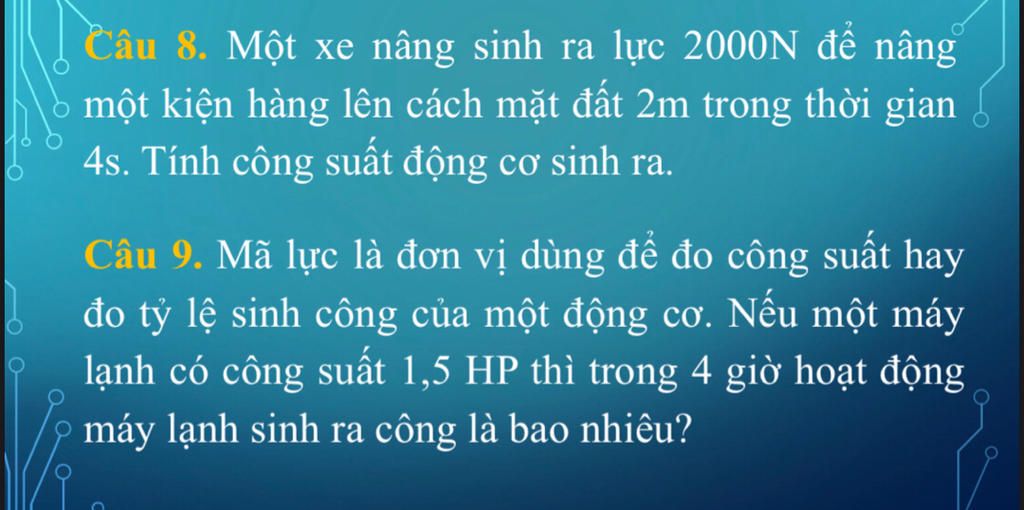 \(P = \dfrac{A}{t} = \dfrac{{Fs}}{t} = \dfrac{{2000.2}}{4} = 1000W\)