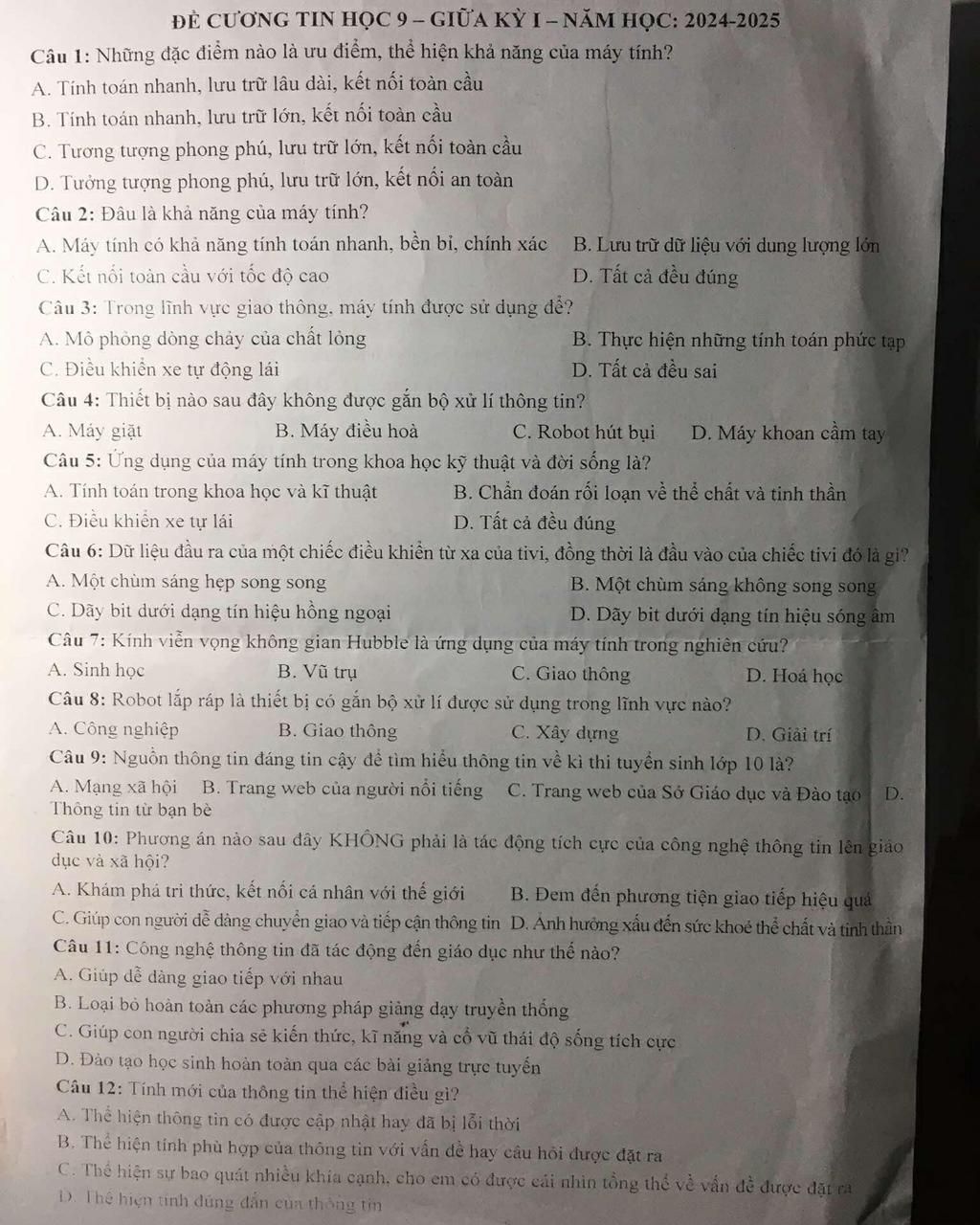 Câu 1:B. Tính toán nhanh, lưu trữ lớn, kết nối toàn cầu.