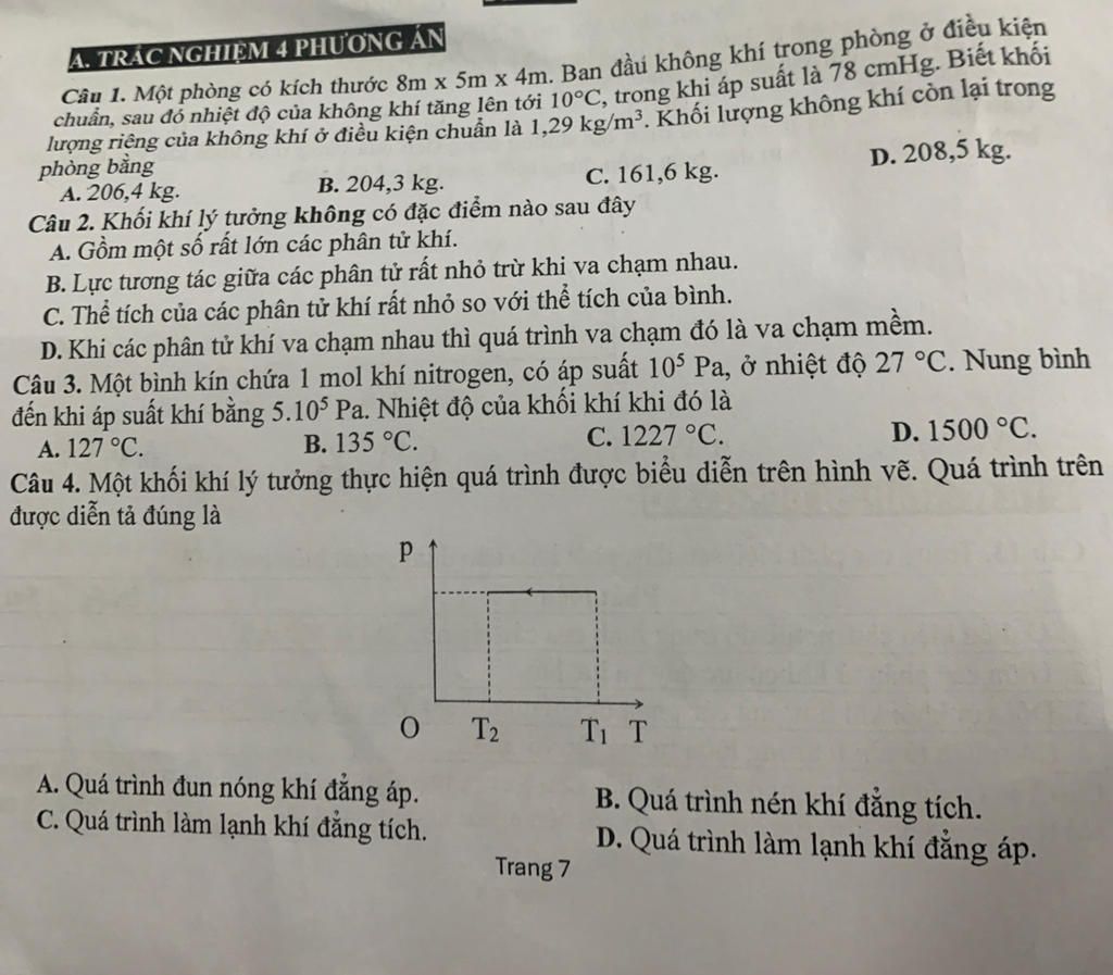 Câu I. Một phòng có kích thước 8m x 5m x 4m. Ban đầu không khí trong phòng ở điều kiện