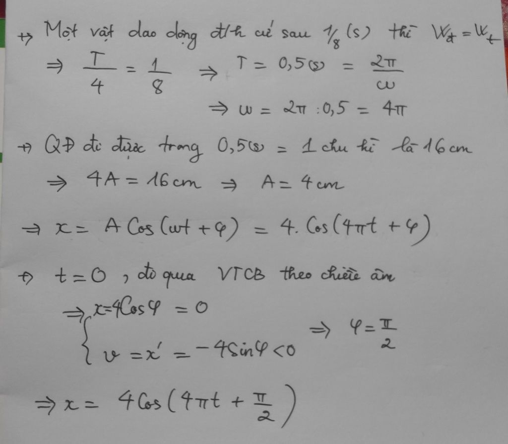 + \(\dfrac{T}{4} = \dfrac{1}{8}s \Rightarrow T = \dfrac{1}{2}s\) \( \Rightarrow \omega = 4\pi \left( {rad/s} \right)\)