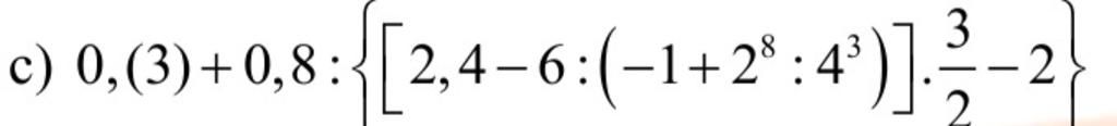 `c) 0,(3) + 0,8 : {[2,4 - 6 : ( -1 + 2^8 : 4^3 )] . 3/2 - 2 }`