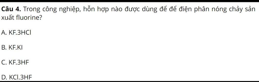 `@` Trong công nghiệp, hỗn hợp gồm KF.3HF được dùng để điện phân nóng chảy sản xuất fluorine