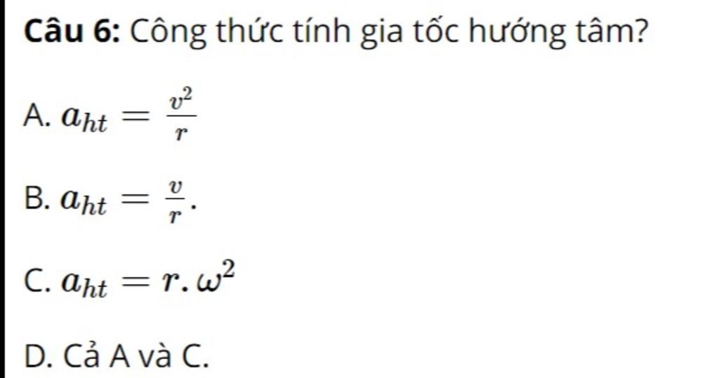 Công thức tính độ lớn gia tốc hướng tâm là `a_{ht} = {v^2}/r = r . ω^2 `