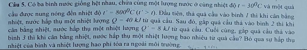 Lấy quả cầu ra rồi thả quả cầu vào bình 3 thì hệ có nhiệt độ `t_3^oC` khi cân bằng: