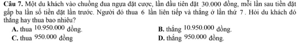 Lấy số tiền thắng tại lần thứ 7 trừ đi tổng số tiền khi thua 6 lần trước thì ta thấy