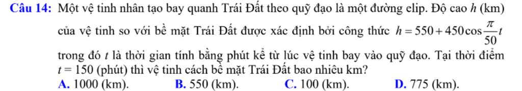 Câu 14: Một vệ tinh nhân tạo bay quanh Trái Đất theo quỹ đạo là một đường elip. Độ cao $h(\mathrm{~km})$ của vệ tinh so với bề mặt Trái Đất được xác định bởi công thức $h=550+450 \cos \frac{\pi}{50} t$ trong đó $t$ là thời gian tính bằng phút kể từ lúc vệ tinh bay vào quỹ đạo. Tại thời điểm $t=150$ (phút) thì vệ tinh cách bề mặt Trái Đất bao nhiêu km?