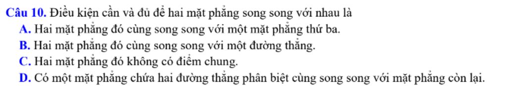Điều kiện cần và đủ để 2 mặt phẳng song song với nhau là có 1 mặt phẳng chứa hai đường thẳng phân biệt cùng song song với mặt phẳng còn lại.