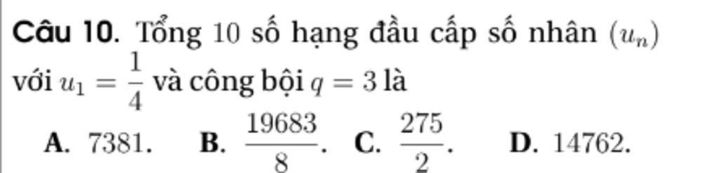 Ta có : `S_10 = 1/4 . ( 1-3^10)/(1-3) = 1/4 . ( 1-59049)/(-2) = 1/4 . ( -59048)/(-2) = (59048)/8 = 7381`
