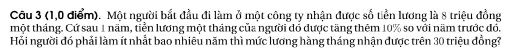 Câu 3 ( 1,0 điểm). Một người bắt đầu đi làm ở một công ty nhận được số tiền lương là 8 triệu đồng một tháng. Cứ sau 1 năm, tiền lương một tháng của người đó được tăng thêm $10 \%$ so với năm trước đó. Hỏ̉i người đó phải làm ít nhất bao nhiêu năm thì mức lương hàng tháng nhận được trên 30 triệu đồng?
