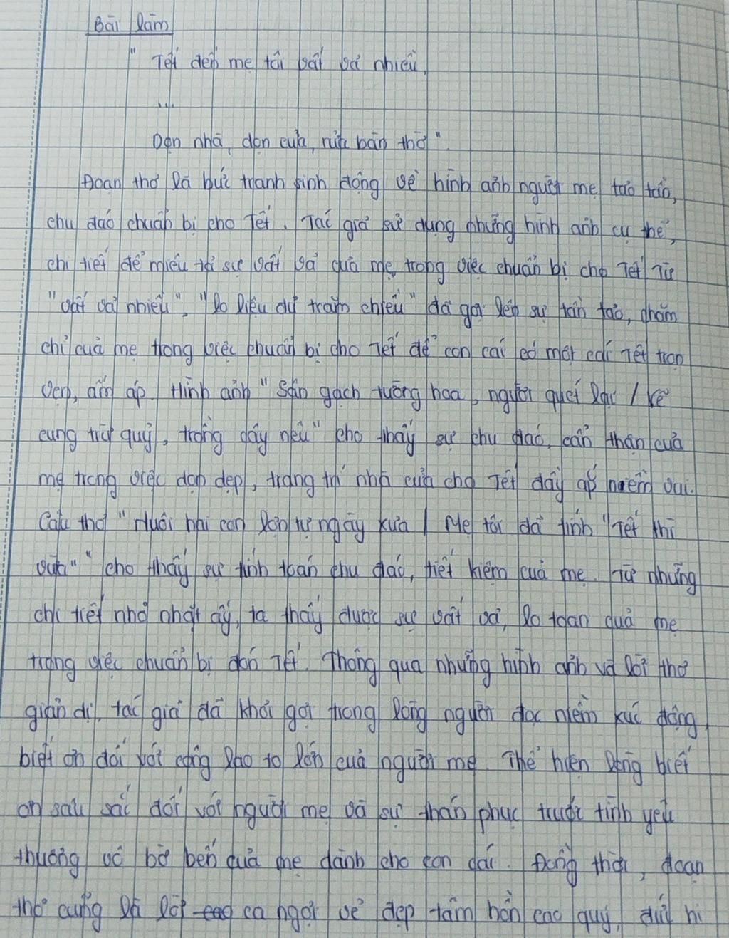 Bài thơ là một bức tranh sinh động về những công việc tất bật của mẹ trong dịp Tết. Từ những câu thơ đầu tiên, tác giả đã khắc họa hình ảnh người mẹ vất vả, lo toan: "Tết đến mẹ tôi vất vả nhiều, / Mẹ tôi lo liệu đủ trăm chiều". Những câu thơ tiếp theo, tác giả miêu tả cụ thể những công việc mà mẹ làm: "Sân gạch tường hoa, người quét lại / Vẽ cung trừ quỷ, trồng cây nêu". Những công việc này tuy đơn giản nhưng lại thể hiện sự chu đáo, tần tảo của người mẹ. Tác giả còn miêu tả thêm về việc nuôi lợn, trữ gạo nếp, gói bánh, dọn nhà, dọn cửa, rửa bàn thờ... Tất cả những công việc này đều được mẹ làm một cách chu đáo, tỉ mỉ, thể hiện sự yêu thương, chăm sóc của mẹ dành cho gia đình. Qua những câu thơ trên, tác giả đã thể hiện lòng biết ơn, kính trọng của mình đối với mẹ. Đồng thời, bài thơ còn ca ngợi những giá trị truyền thống tốt đẹp của dân tộc Việt Nam trong dịp Tết. Tết là dịp để mọi người sum họp, đoàn viên, cùng nhau chuẩn bị những món ăn ngon, trang trí nhà cửa, thể hiện sự ấm áp, tình cảm gia đình. Bài thơ là lời khẳng định về vai trò quan trọng của người mẹ trong gia đình, đồng thời là lời nhắc nhở chúng ta hãy biết ơn, yêu thương và chăm sóc mẹ của mình.