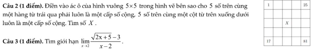 Câu 2 (1 điểm). Điền vào ác ô của hình vuông 5×5 trong hình vẽ bên sao cho 5 số trên cùng