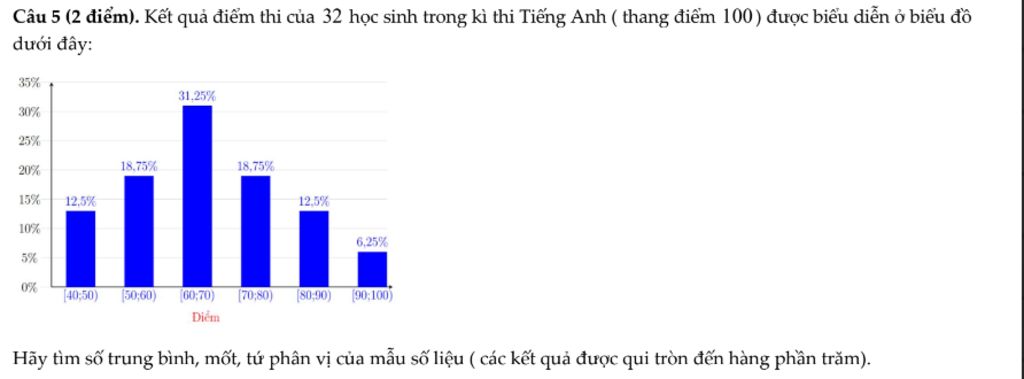 Câu 5 (2 điểm). Kết quả điểm thi của 32 học sinh trong kì thi Tiếng Anh ( thang điểm 100) được biểu diễn ở biểu đồ