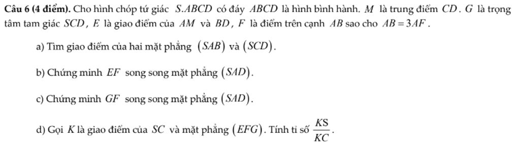 Câu 6 (4 điểm). Cho hình chóp tứ giác $S . A B C D$ có đáy $A B C D$ là hình bình hành. $M$ là trung điểm $C D . G$ là trọng tâm tam giác $S C D, E$ là giao điểm của $A M$ và $B D, F$ là điểm trên cạnh $A B$ sao cho $A B=3 A F$.